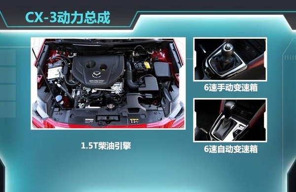 马自达在日本本土所出售的CX-3分为全时四驱和前驱版本,采用马自达设计的扭矩控制式四轮驱动系统,其中搭载具备创驰蓝天技术的1.5升柴油涡轮引擎,在六速自动变速箱或六速手动变速箱配合下可以将油耗分别控制在21.0公里/升,23.0公里/升和25.0公里/升以内。由于新车还采用清洁柴油发动机,可使其活塞内部震动噪音大幅降低。