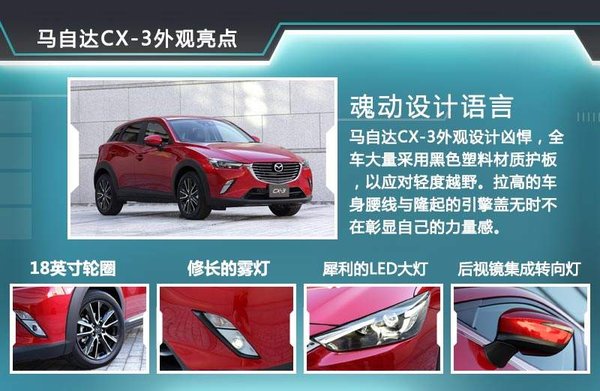 CX-3在外形设计方面延续了马自达家族式设计语言,魂动设计动感而时尚。叶子板边缘则采用黑色塑胶材质的轮眉,使得这样一款主打城市性能的SUV又增添了几分硬汉性格。新车有望搭载18英寸双色轮圈,在低扁平率轮胎的搭配下,无论操控感还是美观度都会十分具有竞争力, 个性十足的雾灯与LED大灯遥相呼应,而集成转向灯的后视镜则符合时下设计潮流。CX-3的长宽高分别为4275/1765/1550mm,2570mm的轴距足以保证车内的空间。