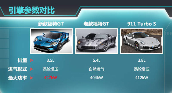 对比来看,老款GT搭载5.4L V8自然吸气引擎,最大功率达到404kW,全新3.5T引擎领先该款引擎43kW。保时捷911系列中以动力强劲著称的911 Turbo S,搭载3.8L 双涡轮增压引擎,最大功率为412kW,此项数据同样落后于新款福特GT搭载的3.5T引擎。换搭全新引擎的福特GT在动力性能方面实现了对老款产品及竞争对手的超越,在同类车型市场上的竞争力得到进一步提升。