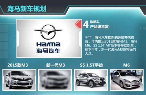 进入海马2.0时代后,其车型产品线不断丰富,于去年北京国际车展上推出新一代福美来M5、海马M3、海马M8、海马S7多款车型。今年,海马汽车推新的速度并未衰减,年内推出2015款海马M3、海马M6、S5 1.5T MT版本等多款新车,在下半年,新一代海马M3也将面向大众。