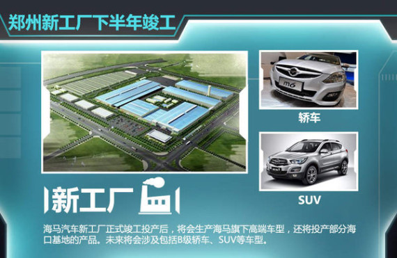 海马汽车郑州新工厂从2010年奠基,历时四年耗资30亿元。届时,将与海马郑州中牟工厂、海马郑州第二工厂形成年产50万台的产能。据相关人士透露:海马汽车新工厂正式竣工投产后,将会生产海马旗下高端车型,还将投产部分海口基地的产品。未来将会涉及包括B级轿车、SUV等车型。