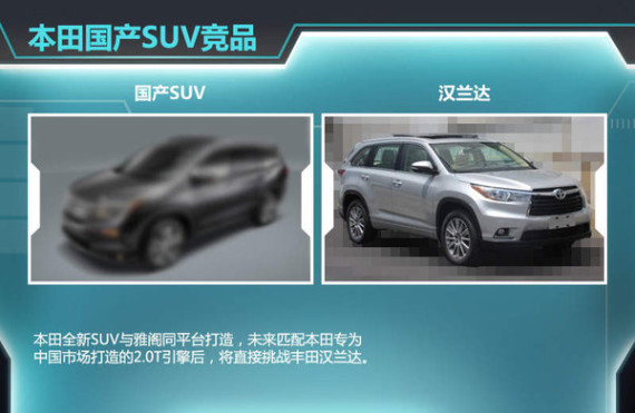 此外在动力方面,东风本田内部人士曾向媒体透露:“本田针对中国开发的包括2.0T在内的三款增压引擎最早将在2016年投产”,因此,从投产时间来推算,本田全新国产SUV有望迎合市场需求增搭2.0T引擎,以更好地瓜分丰田汉兰达领衔的中型SUV市场份额。