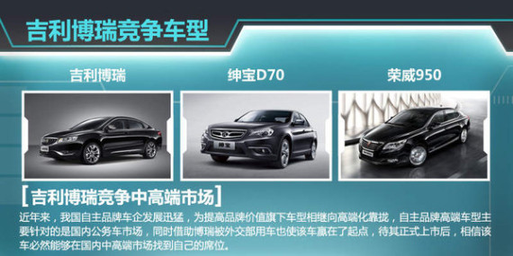 近年来,我国自主品牌车企发展迅猛,为提高品牌价值旗下车型相继向高端化靠拢。其中,自主品牌高端车型主要针对的是国内公务车市场,博瑞适时的推出,也正是赶上这个潮流趋势。借助博瑞被外交部用车也使该车赢在了起点,待其正式上市后,该车必然能够在国内中高端市场找到自己的席位。届时,博瑞将与绅宝D70、荣威950领衔的自主高端车型展开竞争。