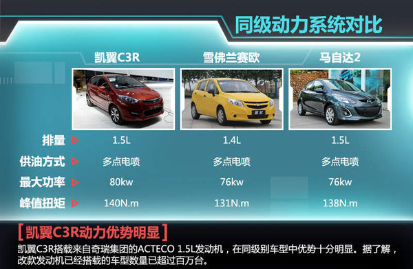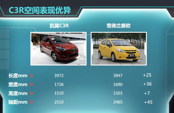 在凯翼C3R车型正式推出后,将与雪佛兰赛欧两厢和马自达2两厢等小型车展开竞争,其中赛欧车型是目前国内市场中知名度和销量较高的小型两厢车,去年全系销售7.7万辆。凯翼作为后来的车型虽然在品牌知名度上略为逊色,但其外观造型和内饰工艺都比较新颖时尚,以及燃油经济性上的优势,都大大的提升了凯翼C3R在同级别车型中的竞争力。