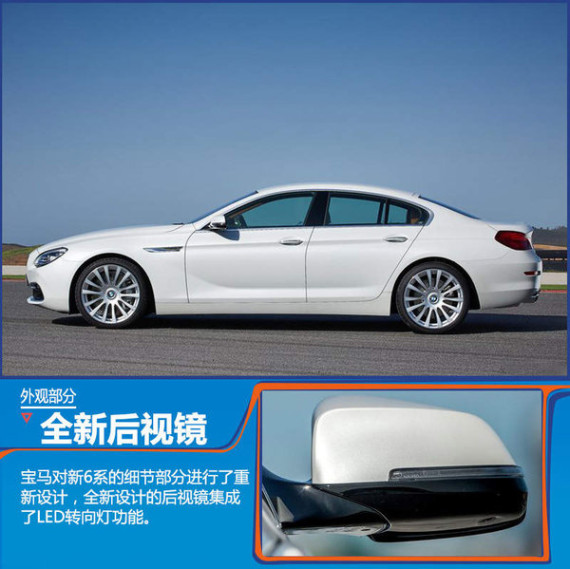 全新6系保持了宝马coupe典型的动态风格,修长的引擎罩,低矮的车顶线条以及前脸及侧面裙边赋予了该车动感,优雅的姿态。此外,车辆侧面的反光镜也进行了重新设计,集成LED光带的转向灯也进行空气动力学的优化,并可以选装新型20英寸铝合金轮圈。