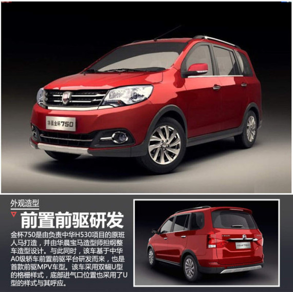外观方面,金杯750是由负责中华H530项目的原班人马打造,并由华晨宝马造型师担纲整车造型设计。与此同时,该车基于中华A0级轿车前置前驱平台研发而来,也是首款前驱MPV车型。该车采用双幅U型的格栅样式,底部进气口位置也采用了U型的样式与其呼应。大面积的镀铬材质装饰使整个车身突显金属质感,而多条“肌肉线”又给人一种速度感。