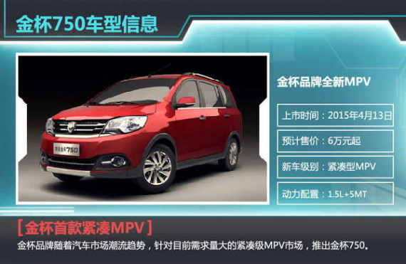 金杯750定位为紧凑MPV,在位于涪陵产区进行生产。新车搭载1.5L发动机,根据空间分布提供3款车型包括1.5L标准型、1.5L舒适型以及1.5L豪华型。车身长宽高分别为4200mm、1695mm和1930mm,轴距达2700mm。