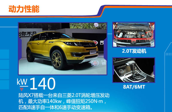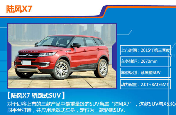 对于即将上市的三款产品中最重量级的SUV当属“陆风X7”,这款SUV与X5采用相同平台打造,并应用承载式车身,定位为一款轿跑SUV。在车身尺寸方面X7较X5有所调整,轴距达到2670mm。动力方面,陆风X7搭载一台来自三菱2.0T涡轮增压发动机,最大功率140kw,峰值扭矩250N·m,匹配8速手自一体和6速手动变速箱,满足不同用户的需求。