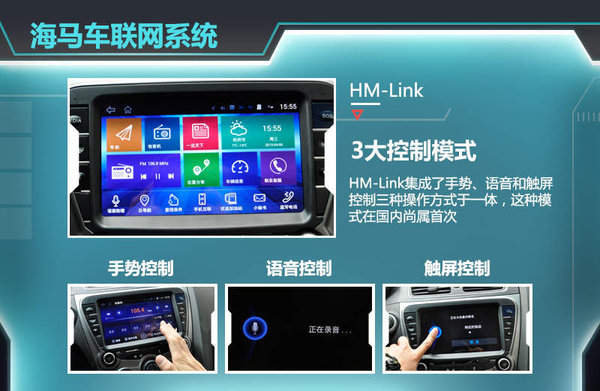 过去一段时间,海马汽车都在潜心开发自己的车联网系统HM-Link,而此次上市的两款新车正是搭载这套系统的首批车型。与其他车企使用的车联网系统相比,HM-Link拥有很多独具匠心的设计,比如集成了手势、语音和触屏控制三种操作方式于一体的模式在国内尚属首次。