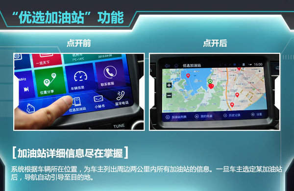 除了炫酷的先进功能外,HM-Link没有忽略人们用车中经常遇到的难题。最能体现人性化的设置当属“优选加油站”功能,系统可根据车辆所在位置,为车主列出周边两公里内所有加油站的信息。一旦车主选定加油站,导航系统会自动引导车辆至目的地。