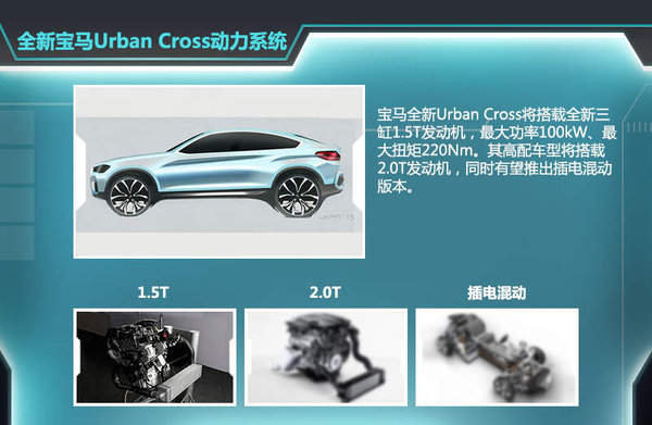 宝马全新Urban Cross基于UKL平台,同平台产品有宝马2系Active Tourer、全新X1以及全新1系,上述产品的入门车型均会搭载全新1.5T三缸发动机。这款发动机由原宝马N54系列六缸发动机演化而来,沿用N54系列缸内直喷、Valvetronic可变式气门正时等技术,燃油经济性较现款N20系列四缸发动机提高5-15%。在不同调校下,其最大功率为100~149kW、峰值扭矩范围179~249Nm,压缩比达11:1。预计这款小型SUV将使用2系运动旅行那一套调校,最大功率100kW而峰值扭矩220Nm。此外,新车仍将有2.0T发动机版本并有望推出插电混动车型。