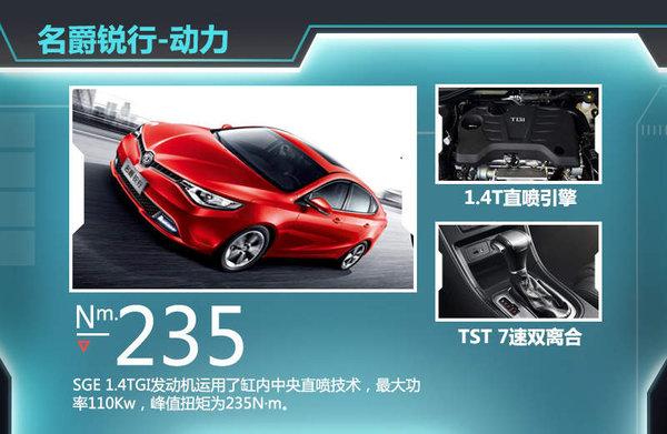 动力方面,名爵锐行提供了1.4T直喷和1.5T两款发动机,其中1.4T主力车型的发动机运用了缸内中央直喷技术,最大功率110Kw,峰值扭矩为235N·m,并保证低转速高扭矩的动力输出。另外,这款发动机采用的是航空级全铝结构,满足欧V碳排放标准,绿色环保。传动方面,与之匹配的是TST 7速双离合变速器,其拥有智能档位预啮合技术,换挡时间低于0.2秒。