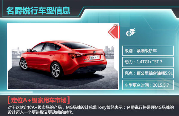 对于这款定位A+级市场的产品,MG名爵品牌设计总监Tony曾经表示:名爵锐行将带领MG品牌的设计迈入一个更进取又更动感的时代。与此同时,该车还是首款应用上汽与北美通用联合开发的CUBE-TECH全新一代动力总成的车型。