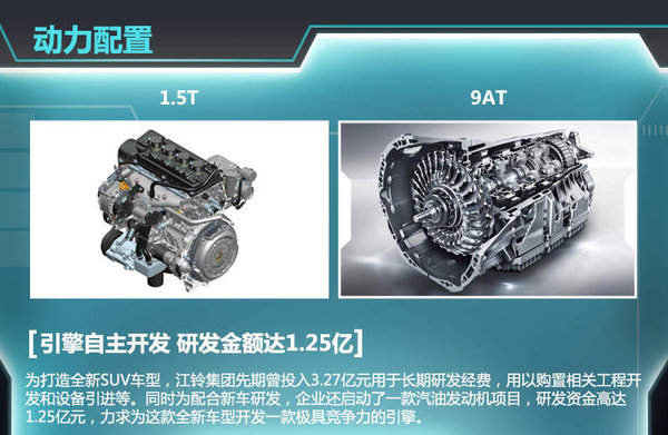 此前,江铃汽车表示将斥资12.12亿元打造一款代号为“N330”的全新SUV车型,这款车就是S330。为配合新车研发,江铃还启动了一款汽油发动机项目,研发资金高达1.25亿元。据悉,该发动机采用缸内直喷技术,最大功率125KW,有望匹配全新9速自动变速箱。作为江铃历时多年打造的第二款SUV,S330配置也非常丰富。据江铃汽车内部人士透露,ESP电子助力转向、适时四驱系统、无钥匙启动进入、CAN网络系统等都将出现在新车上。