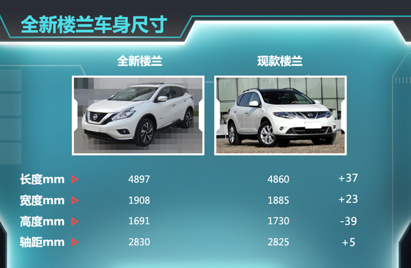 东风日产全新一代楼兰在车身尺寸上也有所升级,相比于现款车型,其车身长度、宽度以及轴距都得到增大,只是车身高度有所降低,新车将给人的感觉将更趋于扁平,尽显成熟、稳重的性格。此外,全新楼兰还搭载了日产最先进的全维预警安全系统,安全性能得到大幅提升。