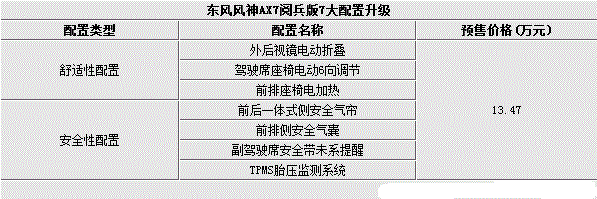 配置方面,东风风神AX7阅兵版增加了包括外后视镜电动折叠、驾驶席座椅电动6向调节、前排座椅电加热、前排侧安全气囊、前后一体式侧安全气帘、副驾驶席安全带未系提醒以及TPMS胎压监测系统共7大配置。