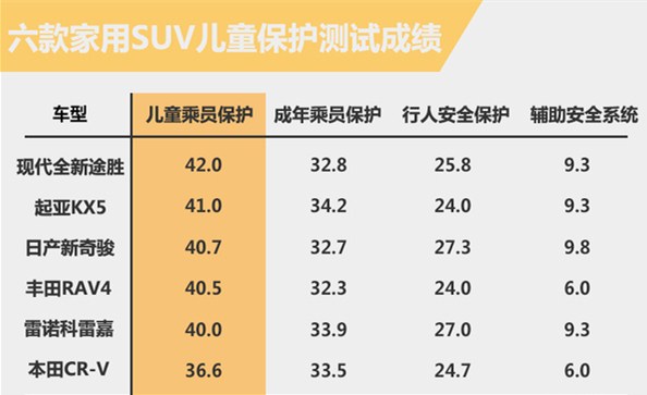 参加碰撞测试的六款SUV车型分别为:现代全新途胜、起亚KX5、日产新奇骏、丰田RAV4、雷诺科雷嘉以及本田CR-V,以上车型均为欧版车。儿童乘员安全测试成绩满分为49分,从公布的成绩可以看出,六款参试车中全新途胜得分最高,拿到了42分;KX5紧随其后,获得了41分的优秀成绩。新奇骏、RAV4和科雷嘉成绩居中,从40.7分到40分不等。此项成绩排在最后一位的车型是BENTIAN CR-V,成绩为36.6分。需要指出的是,以上六款SUV车型均获得了E-NCAP最高5星评级。