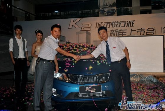 东风悦达起亚汽车临沂中汽4S店销售总监王洛福(右)与沂蒙晚报汽车部刘树刚主任为K2揭幕