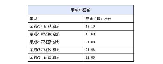 今日,作为上海汽车荣威品牌旗下的首款SUV战略车型,荣威W5正式上市。荣威W5以5款车型的产品布局和17.18万元-29.88万元的中级SUV价格区间,引领国内SUV的主流消费群体分享专业SUV的核心价值,为那些同时对城市驾驭和户外越野功能均有要求的消费者们提供了全新选择。具体售价见下表: