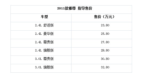(临沂网汽车频道讯)8.16日,天江汽贸高尔夫体验日暨全新雅尊媒体试驾会在临沂宇帆国际高尔夫球场拉开帷幕,来自省市各大主流媒体合计20余家均有到场,齐力揭开全新雅尊性能面纱。小编从工作人员处获悉,2011款雅尊上市车型共有2种排量6类车型,入驻天江汽贸的为2.4L旗舰版,其余车型也将陆续进店。在价格方面,车系售价区间为23.8万-32.8万,具体如下: