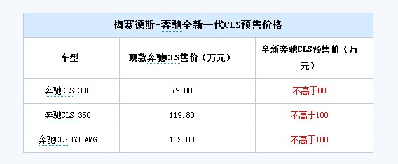 梅赛德斯-奔驰刚刚在两天前宣布了全新一代CLS运动轿车开始接受预订的消息,我们今天又获得了关于这款车的更多消息,新车将于10月份正式上市,售价区间为80-180万之间。全新一代奔驰CLS具体售价变动请您查看下表: