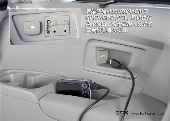 后排娱乐系统可进行分屏显示,全车共有12个扬声器。同时后排提供150瓦的AC电源和HDMI高清接口。