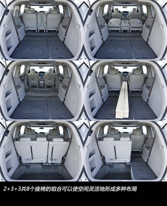 一提到商务MPV,多样的座椅搭配无疑是各自的独门绝技。2011款奥德赛比以往的车型更宽,前排乘客的肩部空间比旧款车型增加约1英寸,2+3+3共8个座椅可以灵活地形成各种布局。与上代车型不同的是,第二排中间增加了一个座椅,同样可以乘坐3名乘客。第三排座椅可以向后折叠,形成平坦的空间,同时第二排座椅也可以自由拆卸,在行李体积较大的情况下也能满足需求。可以说,每个乘客都能享受到足够的乘坐空间。