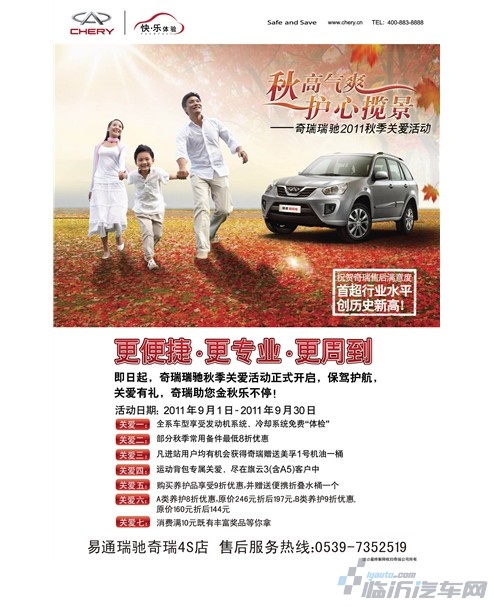 金秋时节,昼夜温差加大,湿度加大,再加上长途跋涉,,极易导致汽车发动机、空调等系统发生问题,此时为您的爱车做一个全方位养护将是十分重要的。奇瑞汽车急车主之所急,适时推出秋季关爱活动,保证您出游时发动机系统冷却系统正常工作,让您真正体会到奇瑞“快·乐体验”服务品牌的宗旨。