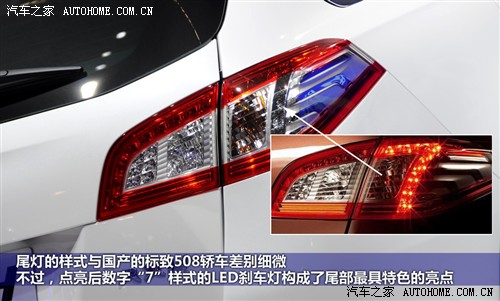 尾部设计不如车头那样可圈可点,基本上沿用了508旅行版的设计,利用LED点阵技术形成的刹车灯构成了左右对称的数字“7”形状的狮爪,大面积和高亮度的尾灯让标致508的行驶安全性有所提升。而底部的金属护板彰显处出色的运动气质。