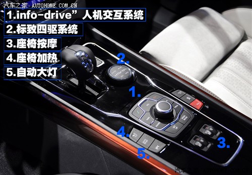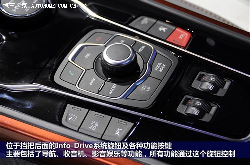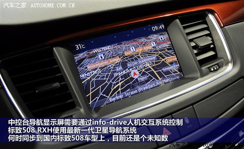 中控台按键略显复杂,但屏幕四周的按键和旋钮的排列划分成几个合理的区域,所有功能一目了然,操作起来应该与标致508轿车毫无差别。值得一提的是,类似于宝马、奥迪等高档车型的(info-drive)旋钮操作系统在标致508 RXH依然配备,方便了驾驶者的日常操作。