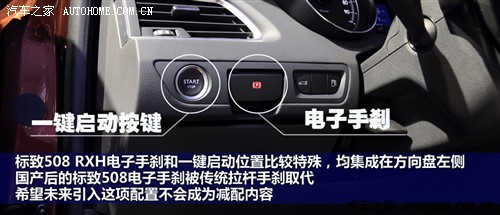 当目光转向中控台左侧,可以看到标致508 RXH还提供了电子手刹及一键式启动功能。标致508上的电子手刹在国产后被传统拉杆手刹取代了,所以不知道未来引入标致508 RXH时还会不会将之减配。虽然用途上没有太大不同,传统手刹的存在不仅影响中控台整体布局,档次感也降低不少。而两项功能放置在仪表台左方,需要一定时间适应。