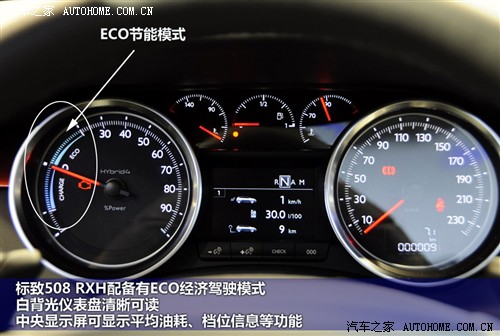 由于使用柴油混合动力,标致508 RXH配备有ECO经济驾驶模式。白背光仪表盘清晰可读,并且支持背景灯强度调节。中央显示屏集成了车辆参数和显示屏调节,比如平均油耗、档位信息等功能,显示内容极为丰富。