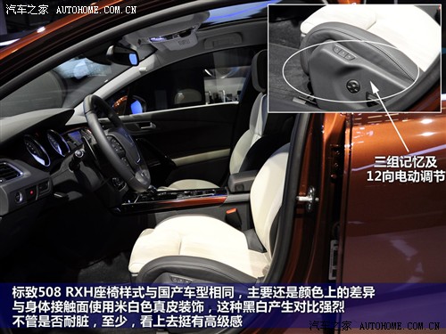 标致508 RXH座椅样式与国产车型一致,不过与身体接触面使用米白色真皮装饰,这种白黑对比强烈,不过挺有高级感,至于白色耐不耐脏还是留到引进国内后再坐讨论。除了拥有不错的包裹性和支撑性之外,12向电动调节、座椅加热以及驾驶席的按摩功能也一应俱全。