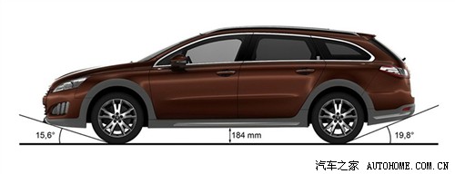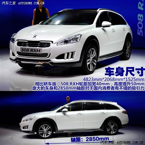 如果粗略的说,标致508 RXH仅比标致508轿车多出了个尾箱,这种相似度即使你在路上见一眼就能认定它俩的关系。为了表达出标致508RXH跨界越野的气场,轮距加宽40mm,车身高度提升50mm似乎是不变定理,最终达到4823mm/2068mm/1525mm(长宽高)的车身尺寸,轴距达到了2850mm。这个尺寸加上相比轿车版多出的尾箱,营造出更富越野的特质、更大气的外形。同时,庞大的车身和超长轴距对于国内消费者对于国内消费者有不错的吸引力。(我们熟悉的标致508车身尺寸为:4826mm、1855mm、1465mm,轴距为2815mm)
