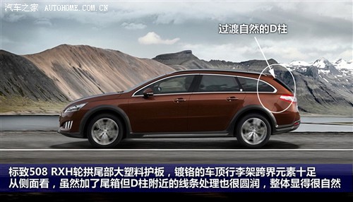 标致508 RXH侧面车身线条流畅,由于融入跨界设计元素,标致508RXH的也对底盘进行加高至184mm,保证车辆更好的通过性。虽然加了旅行车的大尾箱,但D柱附近的线条处理很圆润。从车头到车尾,标致508 RXH并没有给人留下硬朗方正的印象,更多的圆润元素告诉你它是一款定位都市偶尔能撒野的跨界车型。镀铬的车顶行李架、更大的18英寸轮毂和轮拱尾部大塑料护板也强调着标致508 RXH越野跨界的定位。