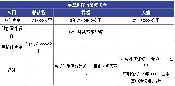 通过对比这三款车的质保信息,我们列出了下面的“质保信息对比表”供大家参考。从“质保信息对比表”中我们可以了解到,别克为君越提供3年/100000公里的整车质保及12个月/不限里程的维修零件质保,是本次对比的三款车中保障最全面的。天籁和帕萨特仅具备2年/60000公里的整车质保,和君越比起来稍显逊色。