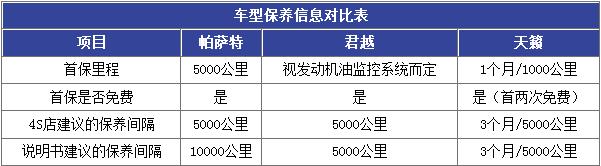 根据说明书上关于保养信息的说明和咨询4S店后,我们列出了“车型保养信息对比表”。从表中我们可以看到,帕萨特的首保里程为5000公里;君越的首保里程要视发动机油监控系统而定;天籁的首保里程为1个月/1000公里。帕萨特说明书上建议的保养间隔为10000公里,是参与对比的三款车中最长的;而君越和天籁说明书上建议的保养间隔均为5000公里。三款车的4S店建议保养间隔为5000公里。