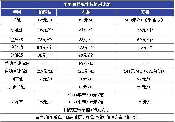 我们采集了这三款车型的常用保养零件的价格,汇总成“车型保养配件价格对比表”。从表格中我们可以了解到,天籁的保养配件价格总体来说要比帕萨特和君越要低。而帕萨特和君越的保养配件价格相比起来差距不大。