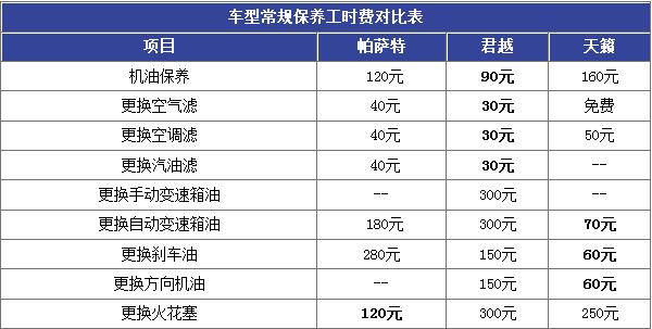 我们采集到这三款车型的常规保养工时费,汇总成“车型常规保养工时费对比表”。从对比表中可以看到,君越的机油保养及三滤更换的工时费是三款车中最低的。天籁更换变速箱油、刹车油及方向机油的工时费是三款车中最低的。君越和天籁的保养工时费比帕萨特要低一些。