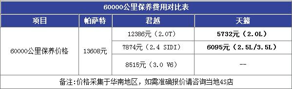 60000公里保养费用对比: