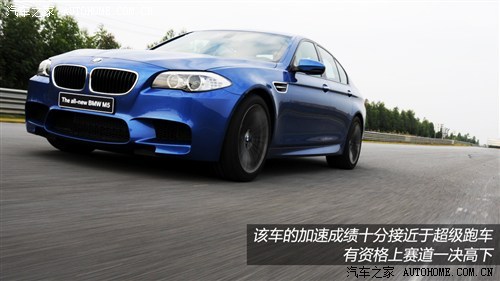 当强大的发动机遇上机敏的双离合变速器,百公里仅用时4.4秒,从静止加速到时速两百公里也仅需13秒。这一相同的过程法拉利FF与599GTB用时11秒;兰博基尼GallardoLP560-4是11.8秒;保时捷Panamera4S是18.5秒,而顶级的PanameraTurbo S是12.9秒。虽然从数值来看M5还未能达到超级跑车标准,但已经与之十分接近,它完全有资格驶上赛道,如果加上赛手本身驾驶技术和整车操控性,究竟谁输谁赢还真说不好。(加速成绩来自官方数值)