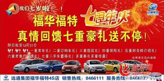 还是那句话:"只要你已经有心仪的车型,只要你已经东奔西跑看过好多次车,那么,好吧!停下已经略感疲惫的脚步,走进福华福特7周年店庆现场,这里,有你梦寐以求的车型,这里有您想象不到的非凡礼品与精彩表演;这里有你渴望的价位要求。即将引爆沂蒙价格底线!错过了“中秋”,错过了“十一”黄金周,错过了数次的“厂家”优惠,岂能错过这次福华福特7周年店庆特惠!震撼无比的福华福特店庆即将展现您的眼前,你还等什么?赶快到临沂福华福特4S店,亲临享受吧!后续报道敬请期待!
