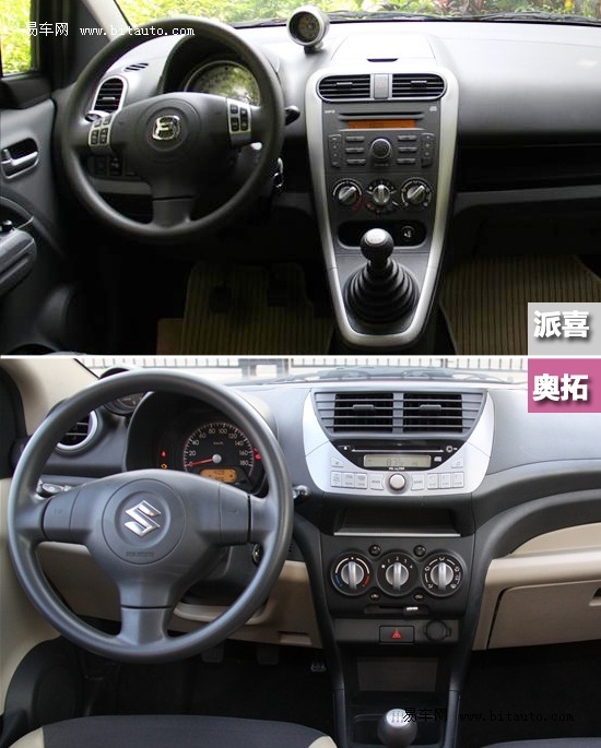 与派喜相比,奥拓则值得肯定,走的是实用路线。在安全配置上,奥拓并不像派喜取消了入门级车型的前排双安全气囊,而是采用全系标配,前排双安全气囊、安全带未系提示、车内中空锁、ABS+EBD等功能一应俱全。此外,在舒适性配置方面,奥拓配备了前后电动车窗、后视镜电动调节、真皮座椅等,只是入门级车型取消了后车门电动车窗、后视镜电动调节。除此之外,奥拓的高配车型还配备了运动外观套件、GPS导航系统,这样的配置在同级别车型中是比较突出。下面我们就挑几款价格相近的车型来进行对比说明。