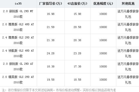 近日易车网编辑从临沂北京现代鲁泰4S店处了解到,北京现代ix35全系优惠一万元并送万元春季旅游礼包。具体降价明细如下表: