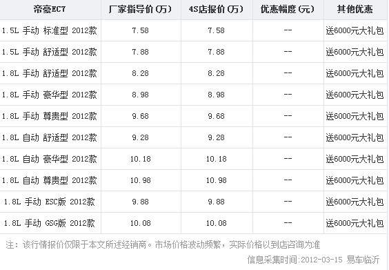 近日小编从临沂帝豪茂华4S店处了解到,目前购买帝豪任意一款车型都可获得6000元大礼包,包括价值2980元的VPS系统,并赠送三年盗抢险和3000元大礼包。具体降价明细如下表: