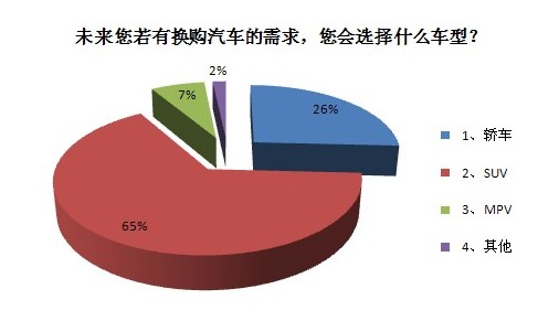 针对当前SUV市场的火爆现状,易车网在广大网民中进行了一次相关调查,在为期一周的时间里,共有17240名网友参与调查,结果显示,有超过六成的网友会将SUV作为换购的首选车型,同时有七成的人认为SUV的大空间、高通过性等迎合消费者心理的特性,是当前SUV市场火爆最主要的原因,而对于自主品牌SUV,网民的认可率接近八成。