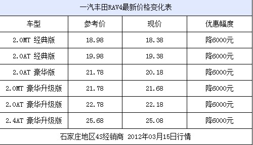 近日,编辑从石家庄东二环裕华丰田4S店了解到,店内丰田RAV4现车比较充足。价格方面,现在购车现金优惠6000元,再赠送价值1.9万元装具礼包。3月17日店内有团购活动,届时将有更多优惠。感兴趣的朋友可到店了解详情。具体型号和价格明细请参见下表: