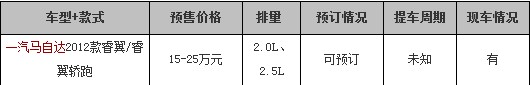 搜狐汽车编辑从一汽马自达临沂骏骐4S店了解到,目前,2012款睿翼已经到店并接受预定,订金为2000元起,提车周期暂时尚不能确定。目前到店的车型睿翼为2.0L精英版和睿翼轿跑2.0L豪华版,因厂商暂未发布该车型的上市信息,价格方面未知。感兴趣的朋友不妨到店内了解详情。