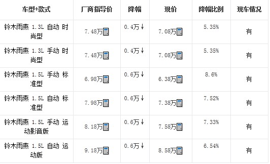 近日,搜狐汽车编辑于临沂地区某长安铃木4S店了解到,现在购买1.3L雨燕可享现金优惠4000元,1.5L雨燕可享现金优惠6000元。现车方面:目前店内现车充足,颜色齐全。店内有试驾车,可试乘试驾。欢迎感兴趣的朋友到店详询。