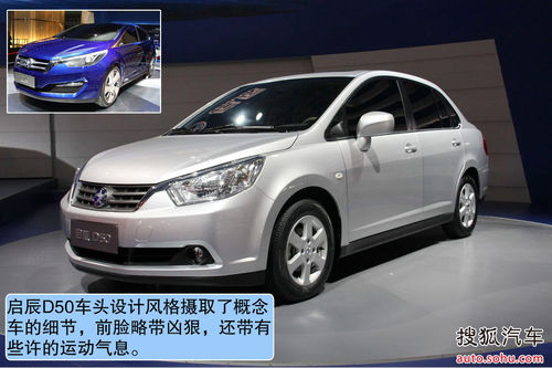 启辰的东风日产推出的自主品牌,其首款量产车型启辰D50也在北京车展上正式上市。启辰D50虽然使用了老款日产颐达车型技术,但重新设计的造型仍然形成了自己的特色,颇具攻击性的前脸和十分饱满的车身设计,都非常讨年轻人的喜欢。